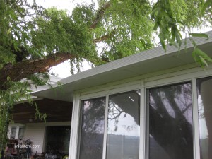 The other tree, next to the house, had been partially uprooted. The roots had formed this huge lump in the surrounding grass and some of the roots broke through the grass and were protruding out. The tree had hit the house, bending the edgy thingy (technical term, I’m sure) for water drainage and hit the roof, but it did not fall onto the house. Somehow, by some miracle, the tree managed to stay rooted strong enough into the ground to only hit the house but managed to keep standing mostly.